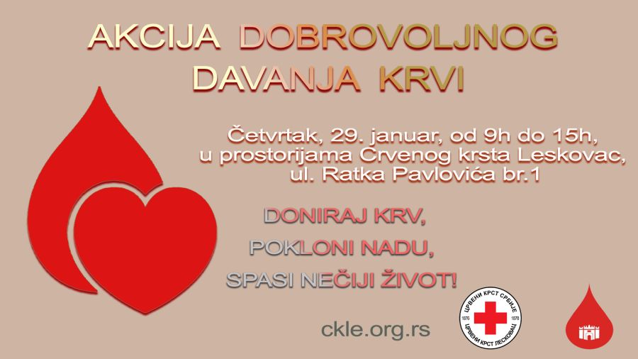 Naredna akcija biće organizovana u četvrtak, 29. januara, u prostorijama Crvenog krsta Leskovac, u zgradi „Starog ureda“, u periodu od 9 do 15 časova.