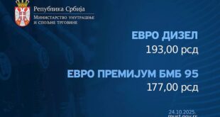 Evrodizel će se u ovom periodu prodavati po ceni od 201 dinar, a evropremijum BMB 95 za 192 dinara za litar.