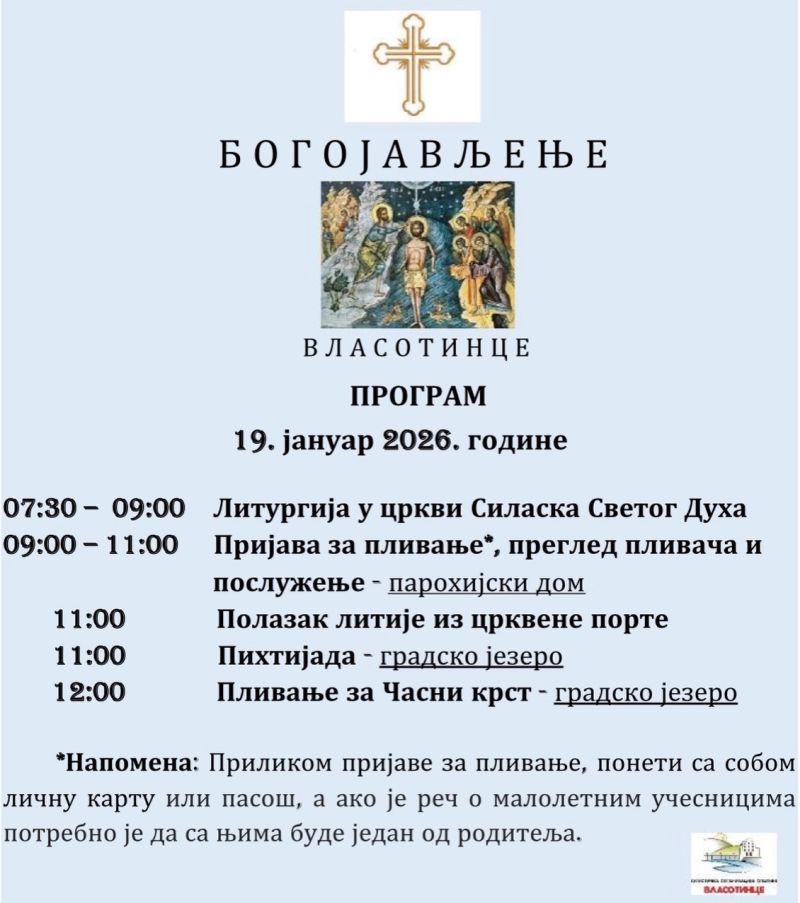 Bogojavljanje je praznik Hristovog krštenja i dan kada su se objavila Sveta Trojica – otac, sin i Sveti Duh, podsećaju sveštenici. U Vlasotincu će ove godine biti 21.godina od kako se organizuje plivanje za